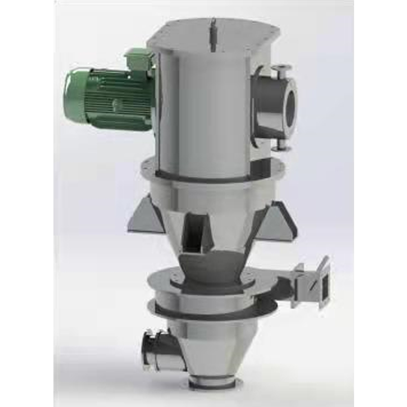物料进入分级室内,外界一次风对物料起风筛作用,使粒子充分分散,并上升至分级区。由于分级叶轮高速旋转,粒子既受到分级叶轮产生的离心力,又受到气流粘性作用产生的向心力,当粒子受到的离心力大于向心力时,即分级粒径以上粗粒子沿容器壁面旋下,外界二次空气通过导流部整流成均一旋流,将混杂或粘附于粗粉中的细粉分离干净,分离后粗粉从下部粗粉口排出;分级粒径以下细粒随气流进入旋风分离器,捕集器收集,净化气体从引风机排出。