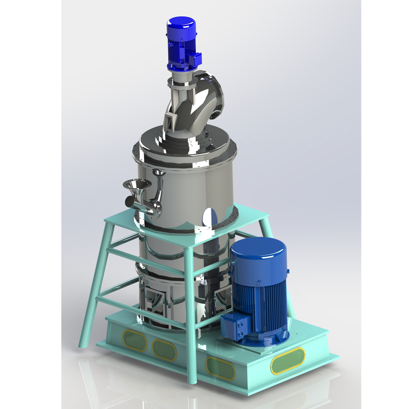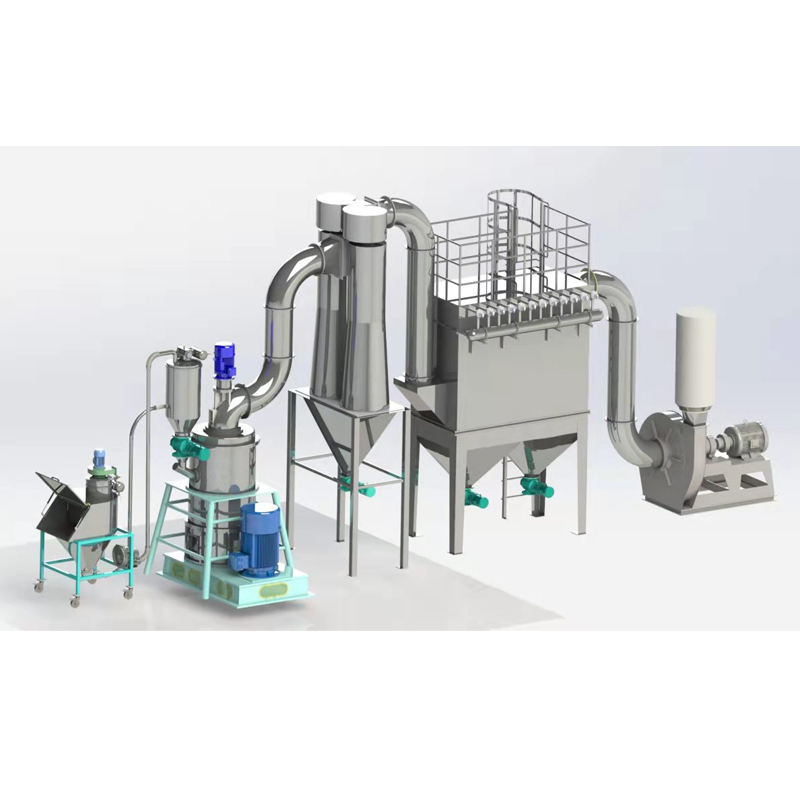 分级电机带动分级轮旋转,形成对粉体的分级作用。成品粒径的大小可通过分级轮转速的快慢进行调节。不符合要求的粗颗粒被叶片抛向外壁在重力的作用下落入研磨室继续进行研磨,符合要求的颗粒穿过叶片随气流形成气固两相流,吸入旋风集料器内,气流与粉体颗粒被气固分离后,粉体颗粒被收集。
